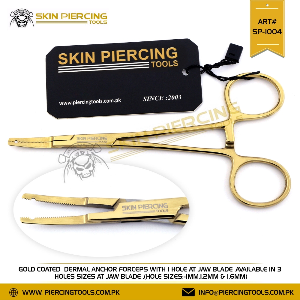 Gold Coated Dermal Anchor Forceps with 1 Hole at Jaw Blade .Available in 3 Holes Sizes at Jaw Blade . (Hole Sizes:-1mm,1.2mm & 1.6mm)
