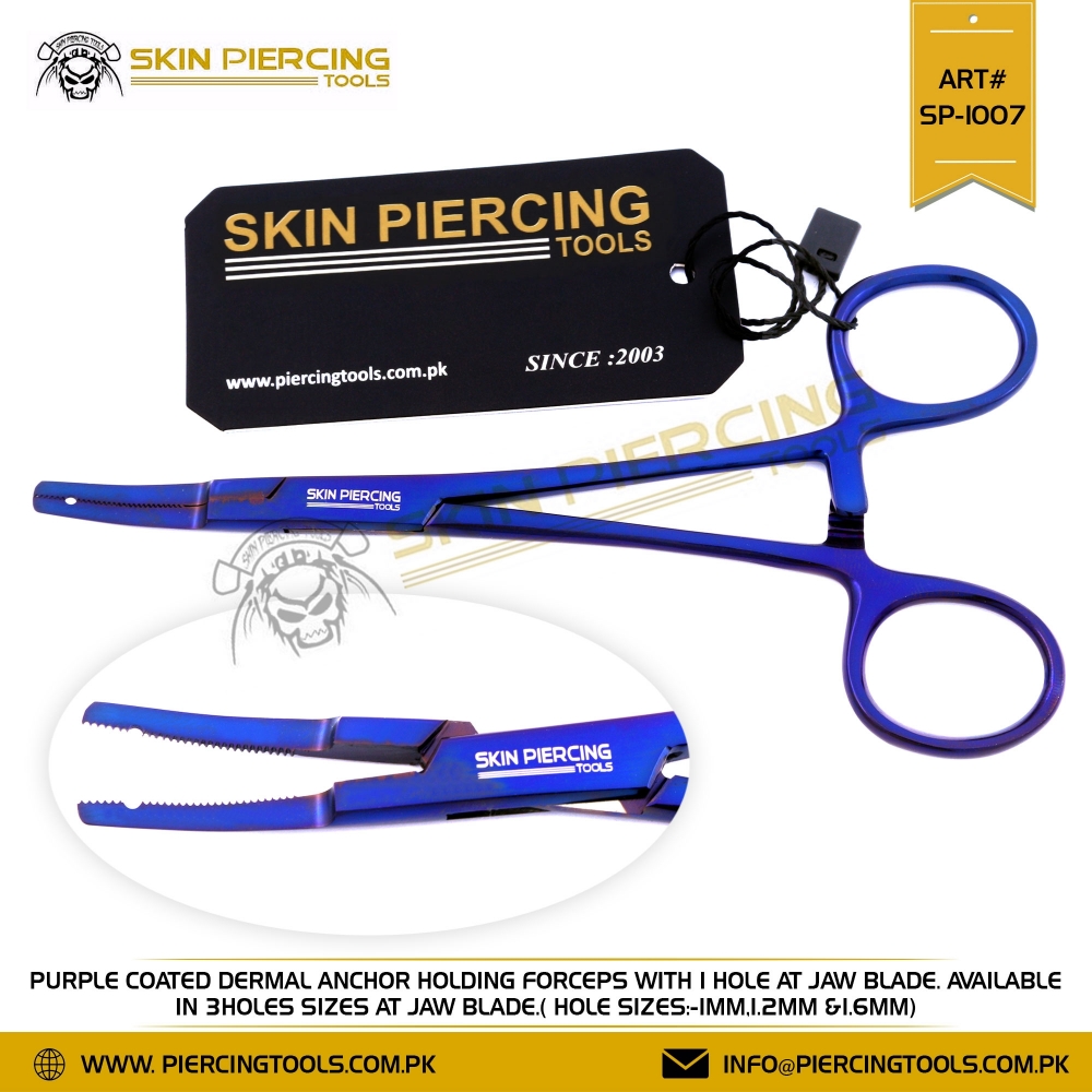 Purple Coated Dermal Anchor Holding Forceps with 1 Hole at Jaw Blade.Available in 3Holes Sizes at Jaw Blade. ( Hole Sizes:-1mm,1.2mm &1.6mm)